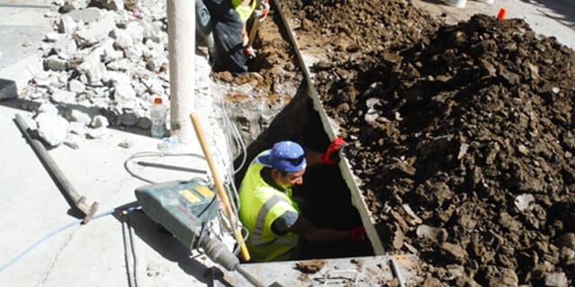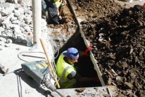 Commercial Retrofitting Process 6 The Worker is Digging Small Hole For Supporting Wood Posts